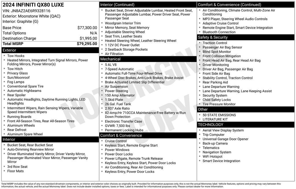 Although every reasonable effort has been made to ensure the accuracy of the information contained on this site, absolute accuracy cannot be guaranteed. Images may not represent actual vehicle (options, colors, trim and body style may vary). All discounted prices are on in-stock inventory only. All inventory must finance through Dealer Provided Lender at standard rates to qualify for the listed price. All vehicles are subject to prior sale. For new vehicles, price includes MSRP, factory-installed options, dealer-installed accessories, and factory transportation costs. For used vehicles, price includes factory installed options and dealer-installed accessories. Price excludes optional equipment selected by the purchaser, $999 LoJack Accessory Fee, $899 dealer fee, state and local taxes, tag, registration, and title fees. See dealer for full details. When texting, in addition to the information you requested on this vehicle, you consent to INFINITI of Cool Springs and its vendors contacting you by texts/calls which may include marketing and be by auto-dialer. Consent is not required to purchase goods or services.