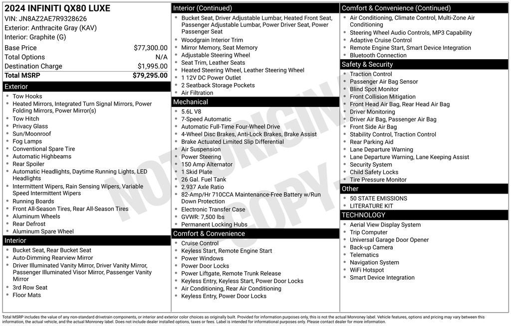 Although every reasonable effort has been made to ensure the accuracy of the information contained on this site, absolute accuracy cannot be guaranteed. Images may not represent actual vehicle (options, colors, trim and body style may vary). All discounted prices are on in-stock inventory only. All vehicles are subject to prior sale. For new vehicles, price includes MSRP, factory-installed options, dealer-installed accessories, and factory transportation costs. For used vehicles, price includes factory installed options and dealer-installed accessories. Price excludes optional equipment selected by the purchaser, $999 LoJack Accessory Fee, $899 dealer fee, state and local taxes, tag, registration, and title fees. See dealer for full details. When texting, in addition to the information you requested on this vehicle, you consent to INFINITI of Cool Springs and its vendors contacting you by texts/calls which may include marketing and be by auto-dialer. Consent is not required to purchase goods or services.